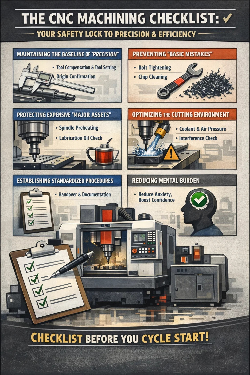 Operar un máquina cnc es como volar un avión o realizar una cirugía; Aunque los movimientos se vuelven fluidos con la práctica, incluso el más mínimo descuido puede provocar pérdidas costosas. Una lista de verificación no pretende restringir su libertad, sino más bien agregar un "bloqueo de seguridad" a su proceso de mecanizado.
